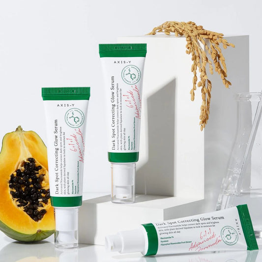 • AXIS-Y Dark Spot Correcting Glow Serum in schöner Verpackung, ideal für Hautaufhellung und Niacinamid Anwendung.