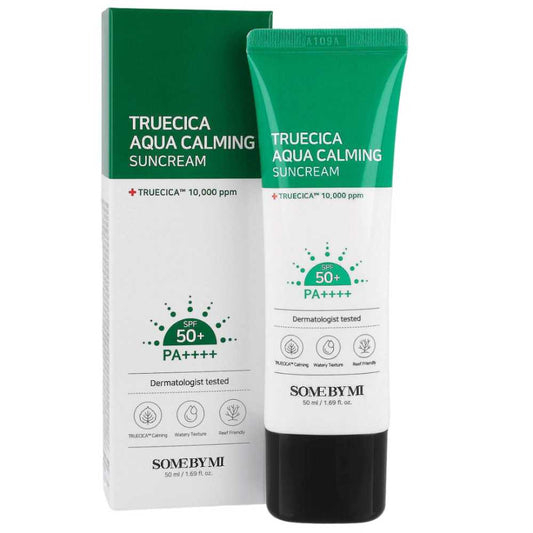 • Truecica Aqua Calming Suncream von Some By Mi in eleganter Verpackung, bietet SPF 50+ Sonnenschutz für empfindliche Haut.