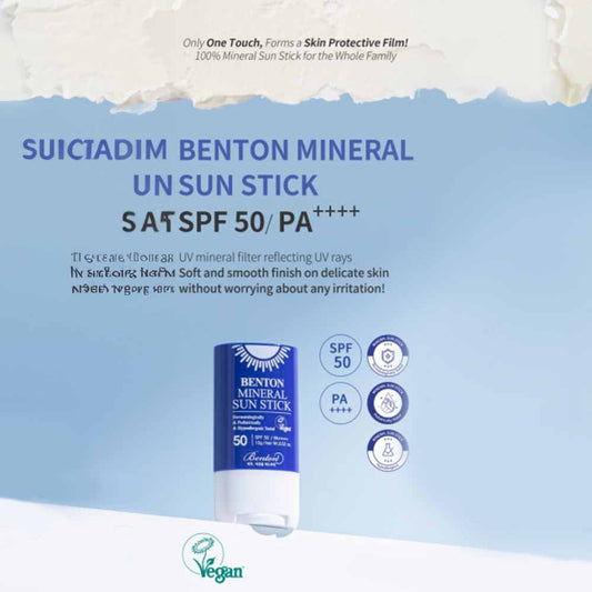 • Benton Mineral Sun Stick SPF50 PA++++ in echter Anwendung auf Gesicht, perfekter UV-Schutz für sensible Haut.