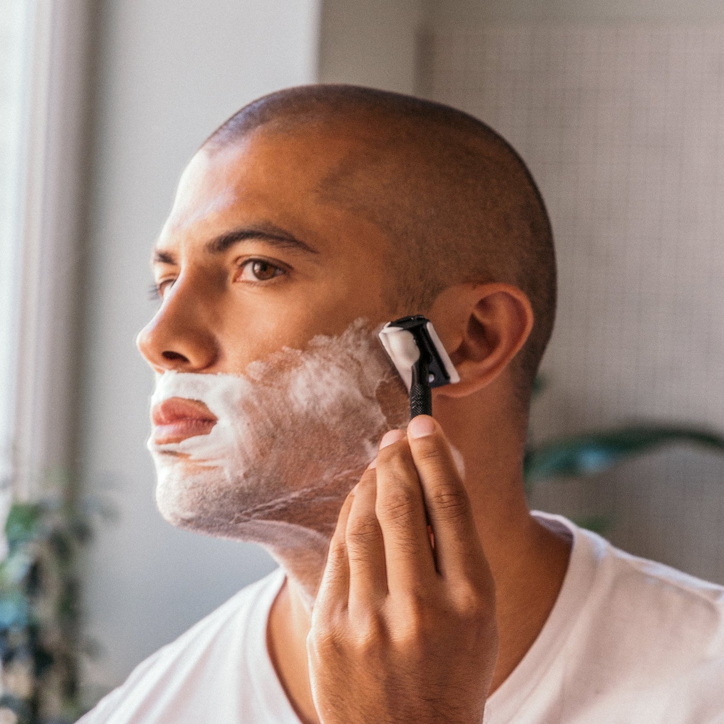 Führe den Rasierhobel sanft über die Haut und verwende dabei Rasiercreme für optimalen Komfort und eine gründliche Rasur. Achte darauf, keinen starken Druck auszuüben, um ein angenehmes Hautgefühl zu gewährleisten.